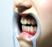 まず写真のように開口器を口に装着します。唾液が漏れないように少し上を向いて下さい。